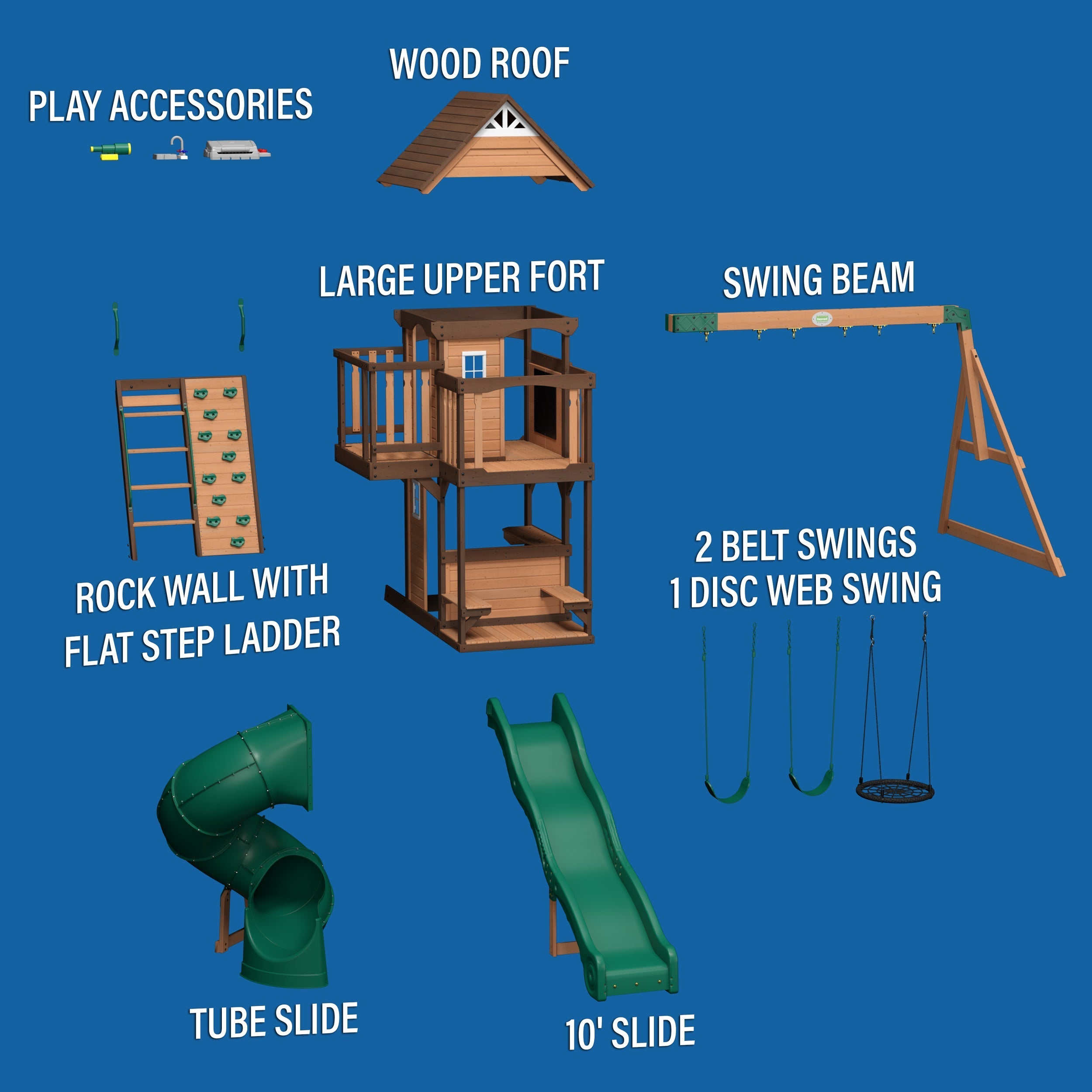 Boredom is never an option with the Cedar Cove Wooden Swing Set by Backyard Discovery. This swing set is action packed with a full assortment of play features perfect for any sized yard. Our unique feature combinations are not typically found on traditional swing sets such as our side-by-side 5 ft challenging rock wall and step ladder, our high-quality web swing and dual slide configuration featuring both a spiral tube slide and 10 ft. wave slide. Our step ladder features flat step rungs making entry into a fun filled upper clubhouse easy for any size of foot, the extra-long metal safety handles provide extra convenience for your child and peace of mind for you.